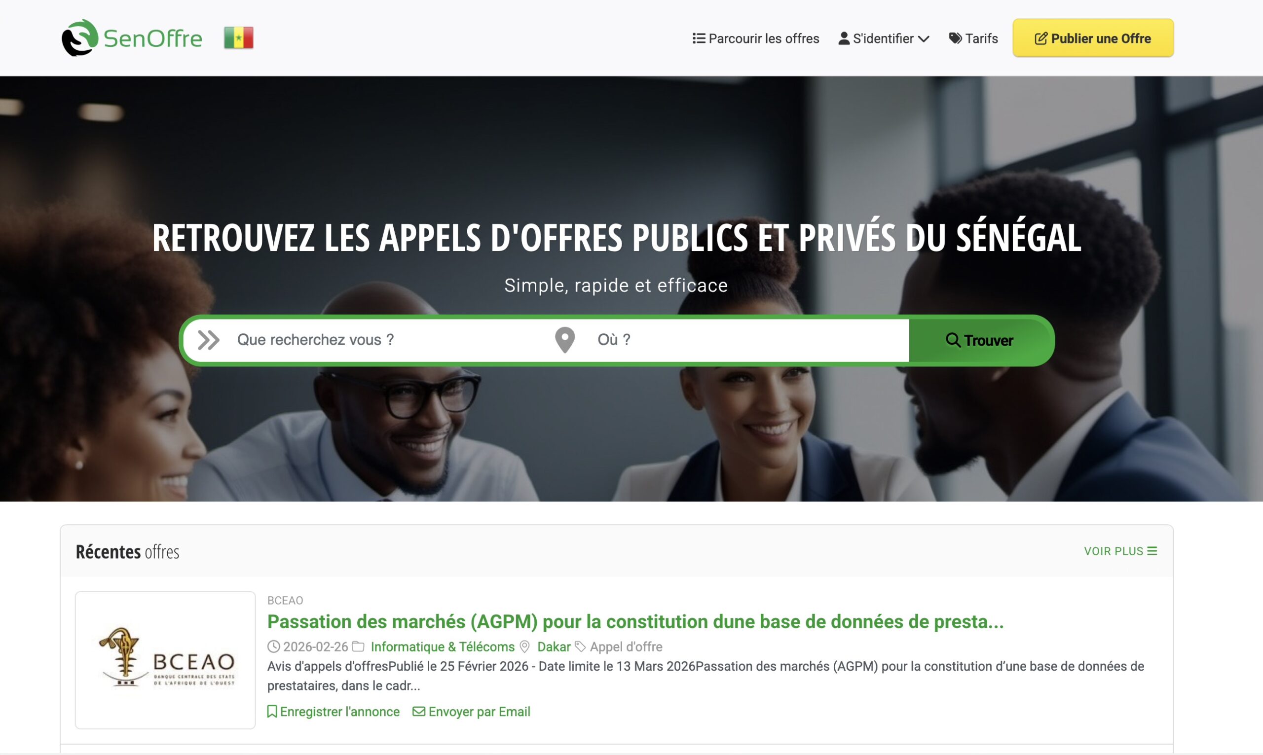 SENOFFRE : est une plateforme numérique dédiée à la publication et au suivi des marchés publics et privés au Sénégal.